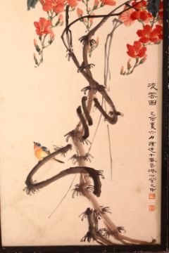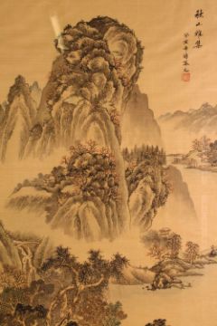 20TH CENTURY CHINESE SCHOOL, mountainous landscape with trees and buildings, signed, image 87cm x 44cm, together with a further painting of a bird perched on a branch, 90cm x 43cm.
