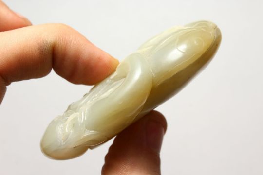 A GOOD CHINESE CARVED JADE PEBBLE OF SHOU LAO, the carving depicting shou lao god of longevity, 7.5cm x 5cm wide.