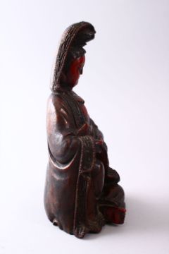 A 19TH CENTURY CHINESE CARVED WOOD & LACQUER FIGURE OF GUANYIN, in a seated position, with carved wave form decoration, 25cm high