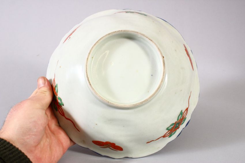 A JAPANESE MEIJI PERIOD IMARI PORCELAIN MOULDED BOWL, with a phoenix in flight amongst raised enamel flora anbd typical imari palate, the exterior with butterflies and objects, 22cm