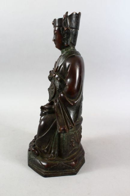 A GOOD CHINESE 19TH / 20TH CENTURY BRONZE FIGURE OF A SEATED EMPEROR, the bronze modelled seated with a carving in his left palm and holding aloft his gown to reveal a dragon, the reverse with moulded dragons, and bearing a six character Yong le mark, 38.5cm high x 18cm wide x 15.8cm deep.