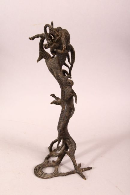 A PAIR OF CHINESE CAST BRONZE DRAGONS, standing on their hind legs, 35cm high.