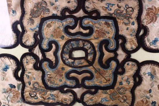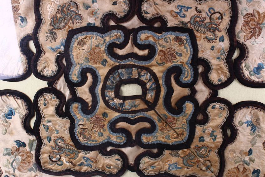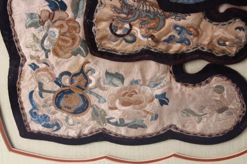 A LARGE QING DYNASTY CHINESE EMBROIDERED FRAMED SILK COLLAR, 80cm square.
