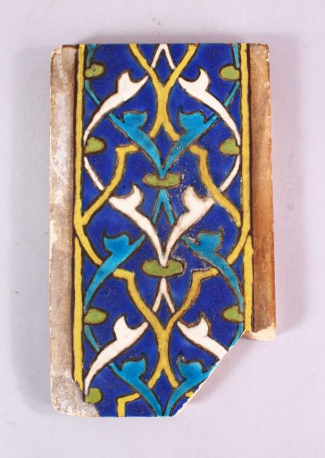 A 15TH CENTURY PERSIAN OR CENTRAL ASIAN TIMURID CUERDA SECA TILE, the tile with stylized motif decoration, the verso with a Christies ex sale label, 25cm x 15cm.