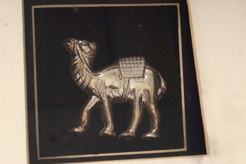A GOOD 19TH CENTURY TURKISH KINJAL DAGGER IN A FRAME WITH A CAMEL AND OIL POURER, white metal, possibly silver, 57cm high x 41cm wide ( framed )