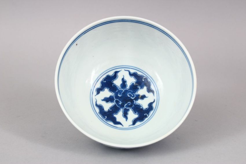 A CHINESE BLUE & WHITE PORCELAIN BOWL, the body with native flora and foliage, the base with a six character mark to base, 13cm.
