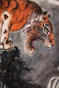 A GOOD 20TH CENTURY CHINESE SCROLL PAINTING, depicting a growling tiger standing on a rocky outcrop with a waterfall below, signed with red seal marks, 135cm x 67cm.