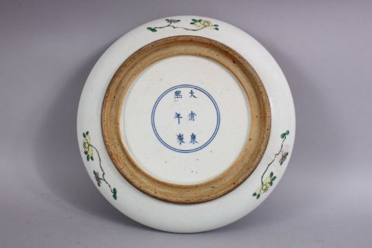 A CHINESE FAMILLE VERTE KANGXI STYLE PORCELAIN BOWL, decorated with scenes of warriors in horseback in battle, in landscape scenes and balcony settings, with precious object border panels and flora, with a six character mark to the base, 28cm diameter.