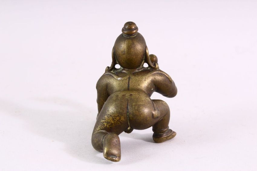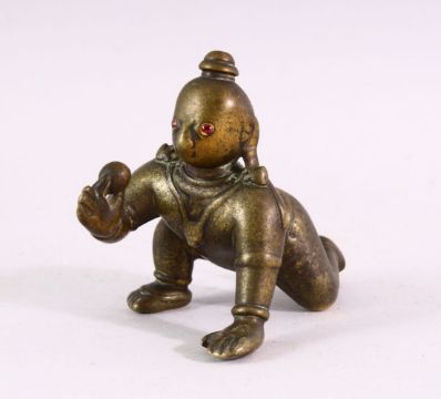 A SMALL EARLY CAST BRONZE INDIAN CROUCHING FIGURE, with inset gold and ruby eyes, 9cm long.