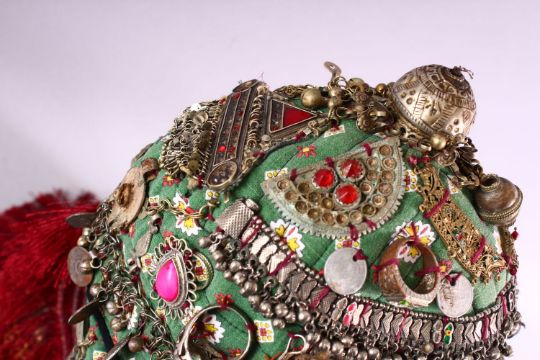 A BALOCHISTAN HEAD DRESS, adorned with coins, rings, beads etc. together with associated overshirt.