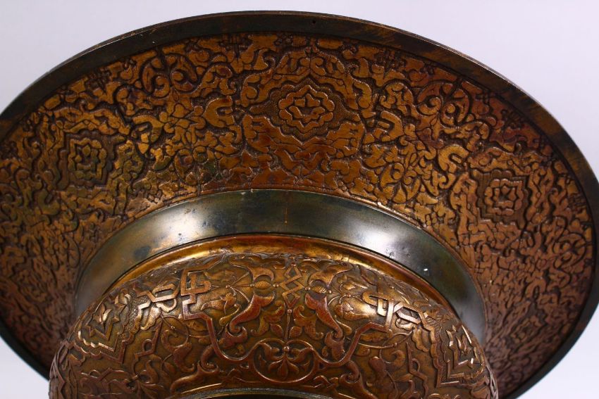 A LARGE ISLAMIC / PERSIAN CARVED BRASS FLARED RIM VASE, with carved or cast decoration of scrolling foliage, 42cm diameter.