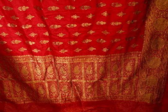 A VERY FINE 19TH CENTURY INDIAN GOLD INLAID SILK TEXTILE, with fine gold embroidery with motif decoration.