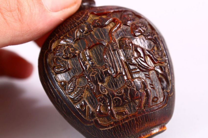 A 19TH CENTURY CHINESE CARVED HORN SNUFF BOTTLE, carved with scenes of an immortal with deer, in landscape scene, 7.2cm