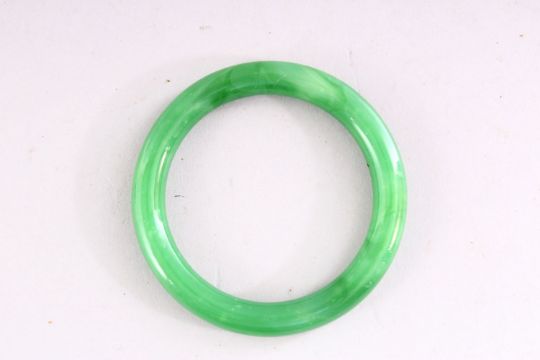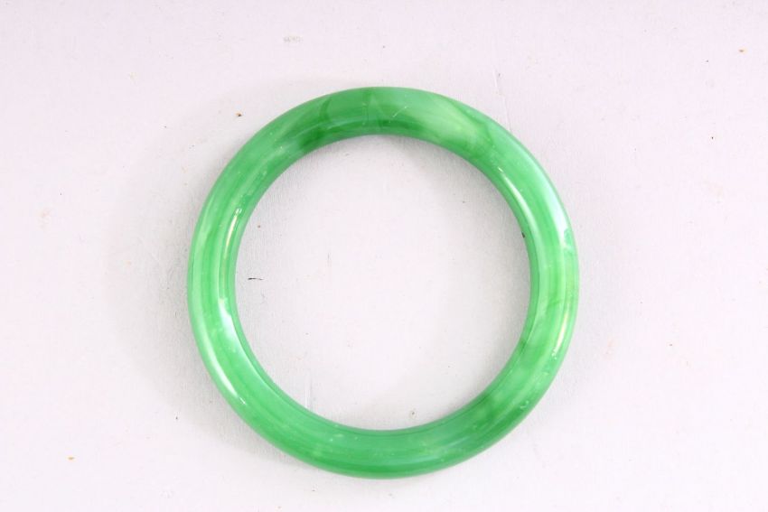 A CHINESE GREEN JADE BANGLE, 8.5cm diameter.