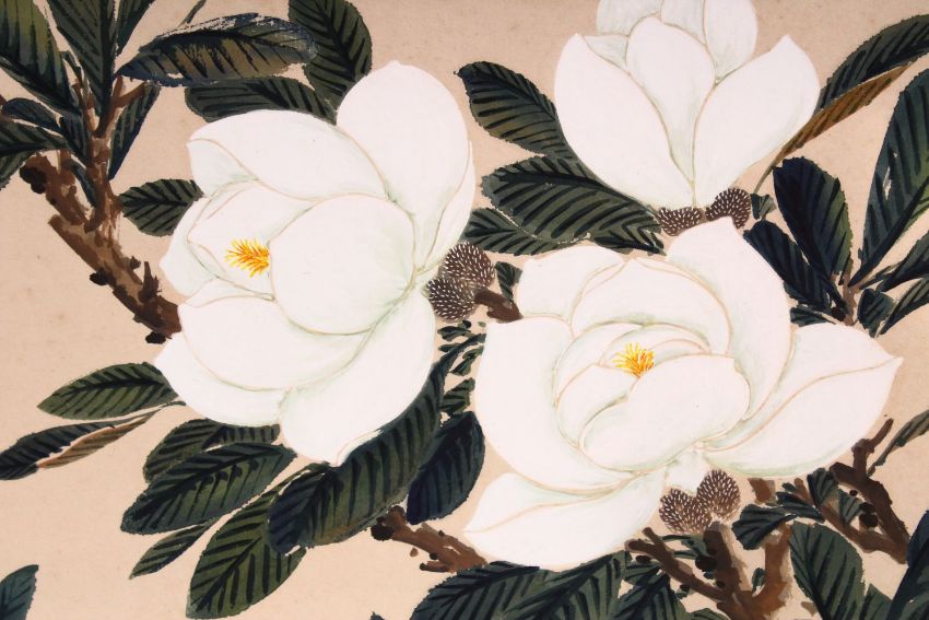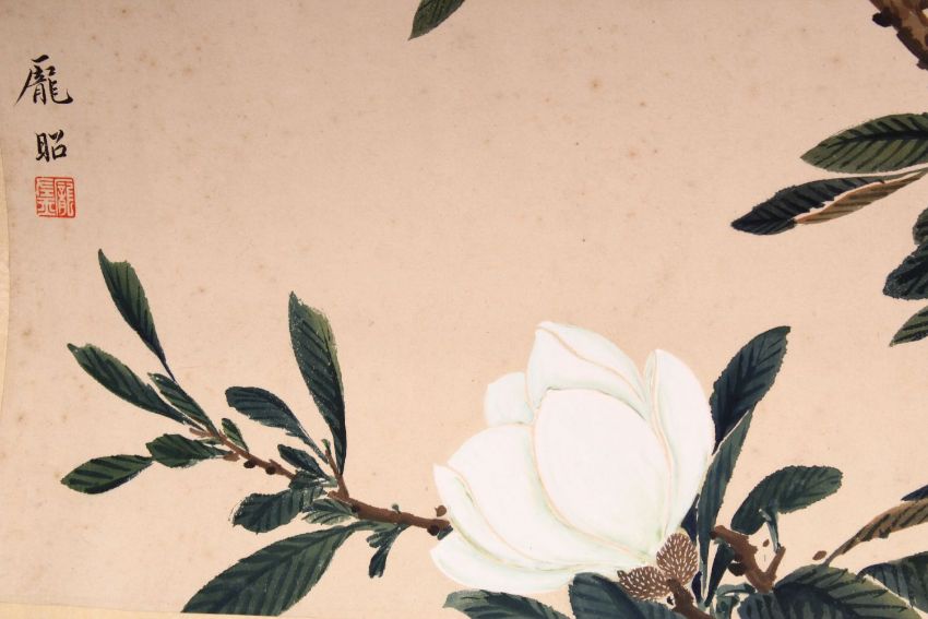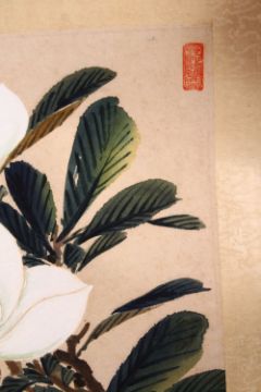 A GOOD 20TH CENTURY CHINESE SCROLL PAINTING, depicting a tree large white blossom, signed and with two red seal marks, 66cm x 32cm, together with six other scroll paintings depicting flora and fauna, various sizes.