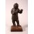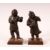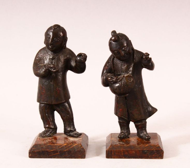 A PAIR OF SMALL CHINESE CAST BRONZE FIGURES OF YOUNG BOYS, holding items in their hand, showing traces of original painted decoration, on wooden stands, 13cm high.