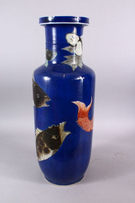A LARGE CHINESE KANGXI POWDER BLUE PORCELAIN CARP VASE, decorated with six swimming carp upon a powder blue ground, the base with double blue rings, POSSIBLY of the period, 59cm high