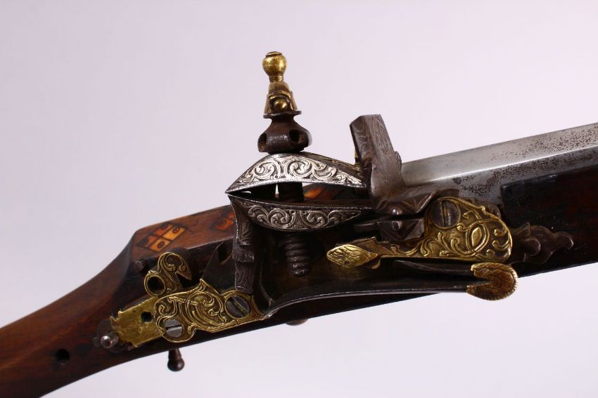 A LONG 19TH CENTURY NORTH AFRICAN RIFLE, with gilt metal mounts, octagonal barrel, with bone and silver inlays to the handle, 170cm high.