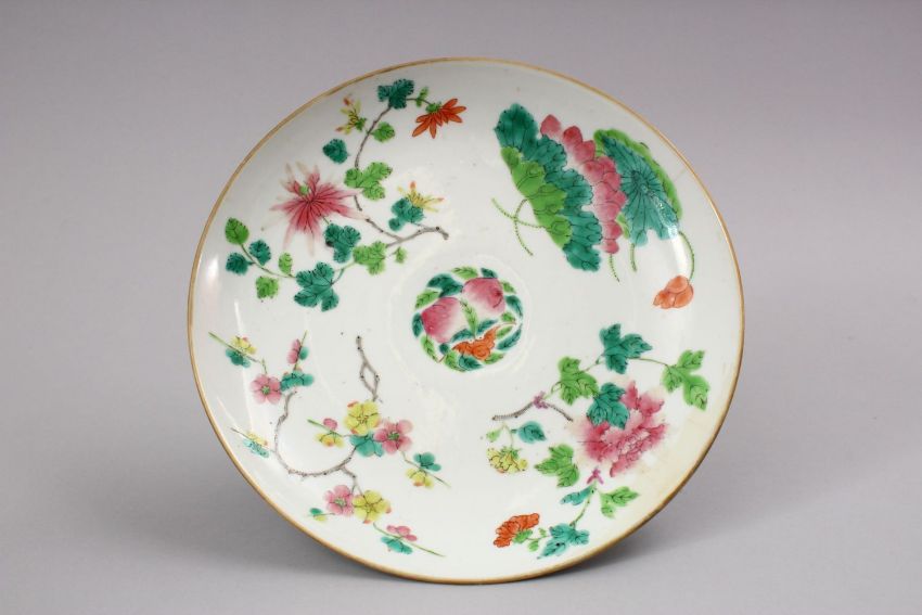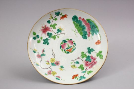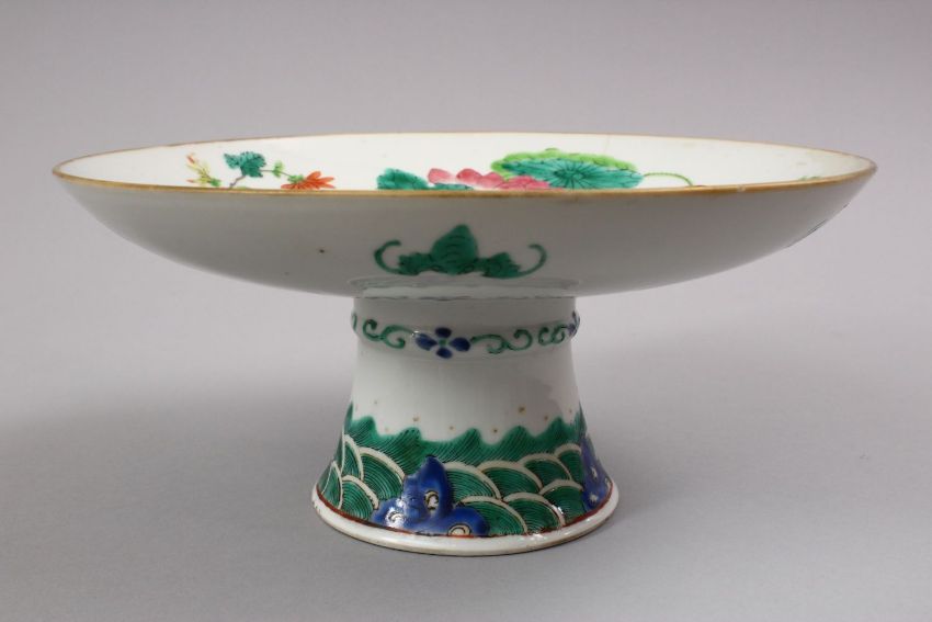 A 19TH CENTURY CHINESE FAMILLE ROSE PORCELAIN STEM DISH, decorated with native array of flora with a lower band of waves and bats, (af) 24cm