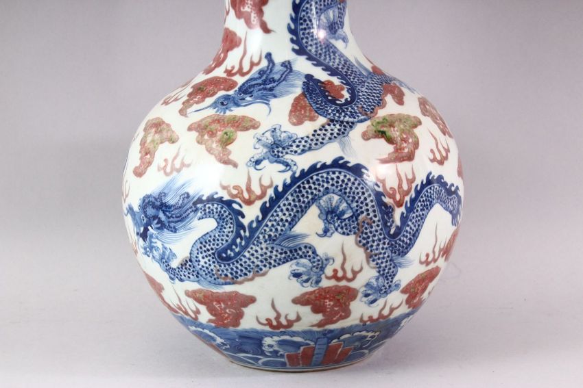 A LARGE UNDERGLAZED BLUE AND COPPER RED DRAGON VASE, painted with dragons amongst clouds, six character mark to base, 36cm high.