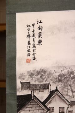 TWO 20TH CENTURY CHINESE SCROLL PAINTINGS, one depicting junks in a river landscape with buildings, the other a parkland scene with skyscrapers, image sizes 100cm x 54cm and 67cm x 45cm.