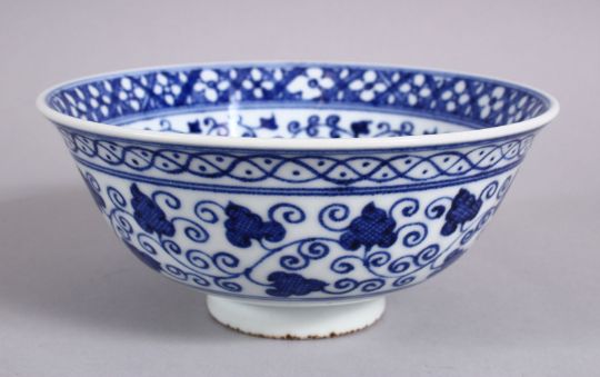 A CHINESE BLUE & WHITE MING STYLE PORCELAIN BOWL, with a central display of lotus, with surrounding lotus scroll, the base with a mark, 15.5cm