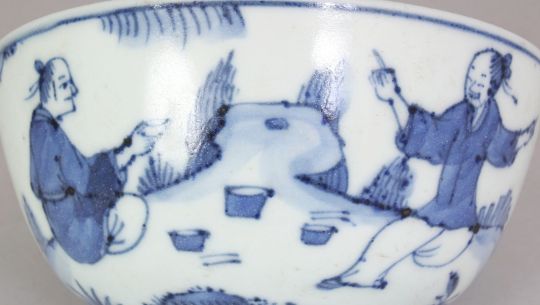A CHINESE WANLI STYLE BLUE & WHITE PORCELAIN BOWL, the sides decorated with figures in a continuous garden setting, the base with a six-character mark, 12cm diameter & 6cm high.