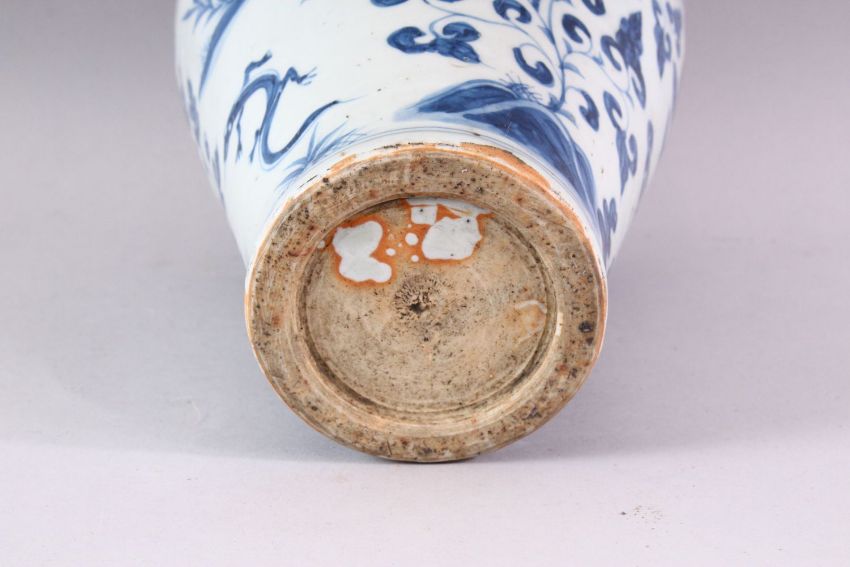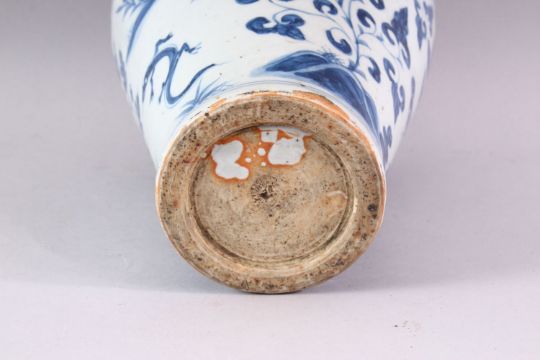 A YUAN STYLE BLUE AND WHITE MEIPING VASE, the body painted with grape and chrysanthemum decoration, 30cm high.