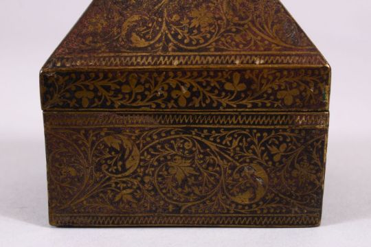 A FINE 19TH CENTURY NIELLO INLAID BRASS INDIAN LIDDED BOX, 7.5cm wide x 5cm deep 6.5cm.