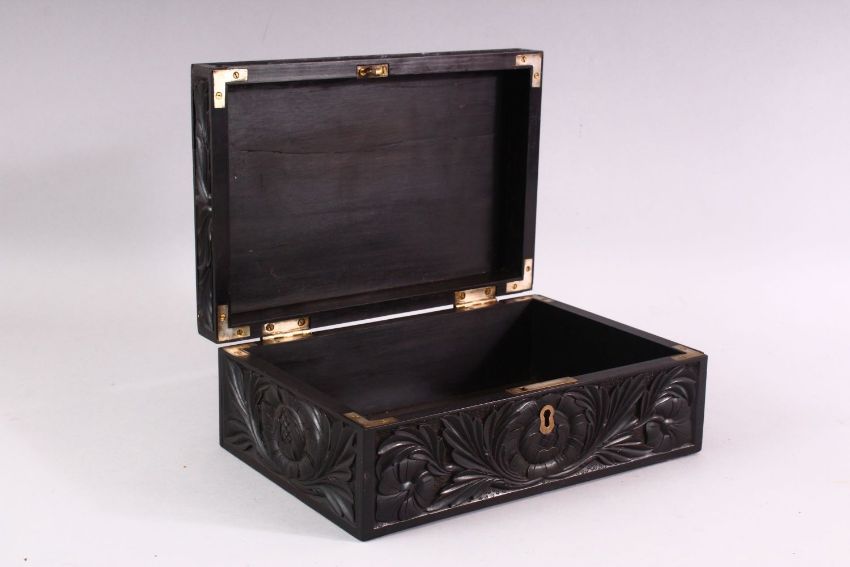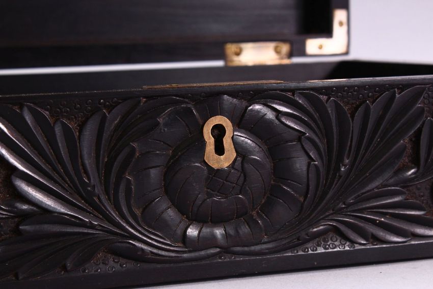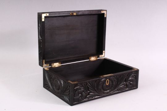 A CEYLONESE CARVED EBONY CASKET, with hinged lid, 26cm long.