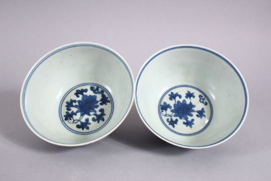 A PAIR OF CHINESE BLUE & WHITE MING STYLE PORCELAIN RICE BOWLS, each decorated with formal scrolling lotus, the bases bearing a seal mark, 13cm