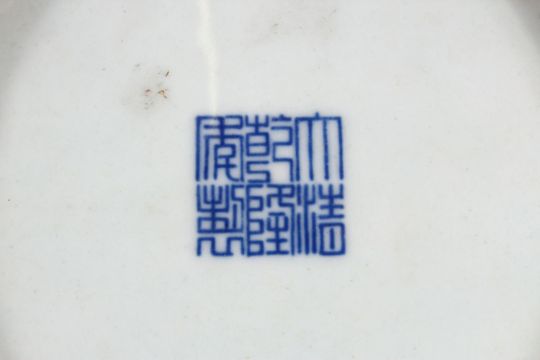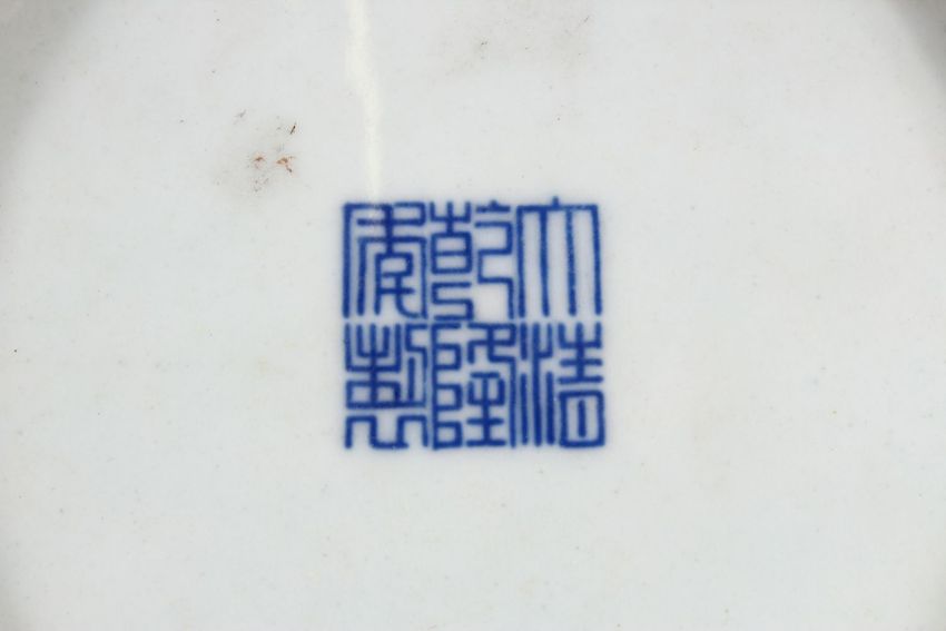 A CHINESE BLUE & WHITE LOTUS BOUQUET PORCELAIN DISH, decorated with a display of lotus, with surrounding decoration of scrolling lotus, the base with a six character Qianlong mark, 20.3cm diameter.