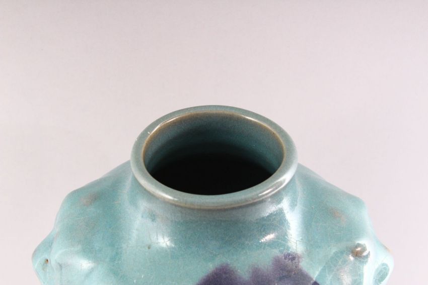 A CHINESE PURPLE SPLASH POTTERY VASE, with moulded lion mask handles, 35cm high.