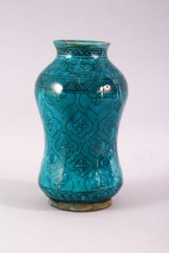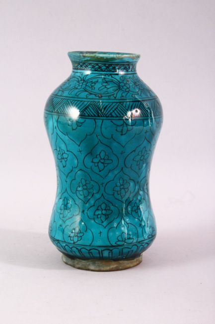 A 19TH CENTURY ISLAMIC MARKET DRUG JAR, with turquoise glazed decoration, 20cm high.