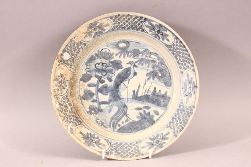 A FOUR CHINESE WANLI PERIOD BLUE & WHITE SHIPWRECK PORCELAIN PEACOCK DISHES.