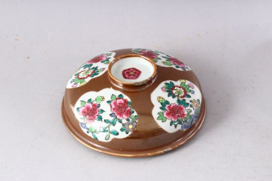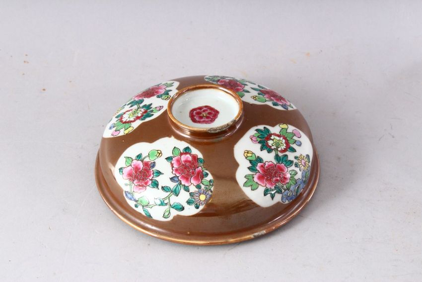 A 19TH CENTURY CHINESE CAFE AU LAIT GLAZED BOWL AND COVER, painted with panels of chrysanthemums, 17cm diameter.