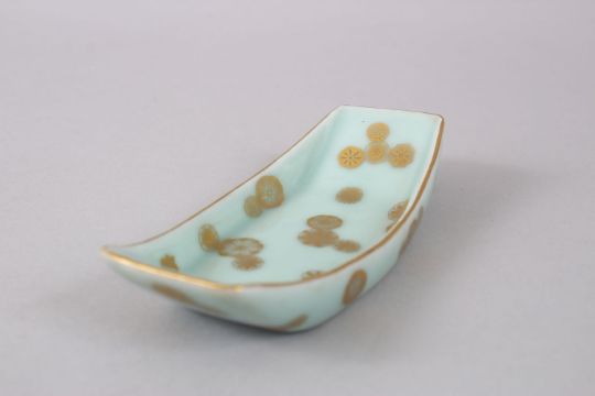 A GOOD CHINESE QIANLONG STYLE CELADON & GILT PORCELAIN TEA CUP SAUCER, the boat shaped vessel decorated upon a celadon ground with gilt mons, the base with a six character qianlong mark, 13cm wide x 6cm deep.