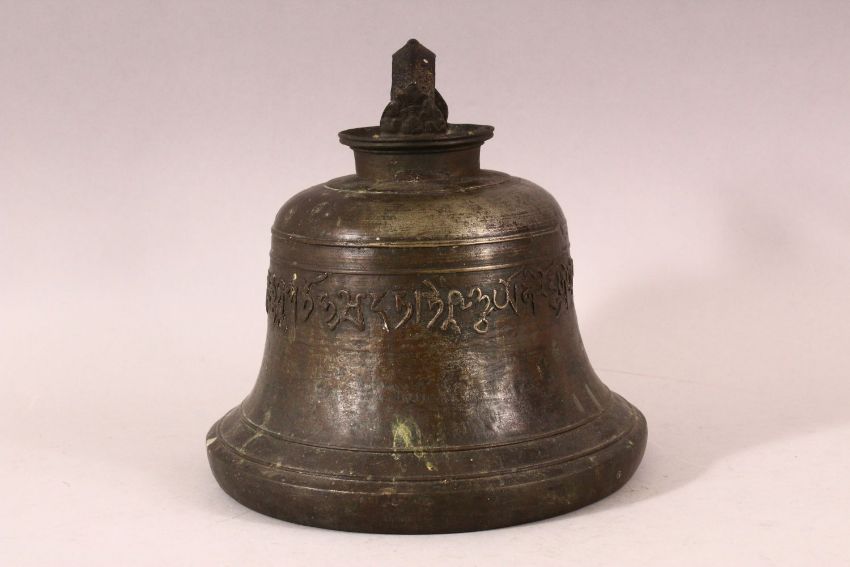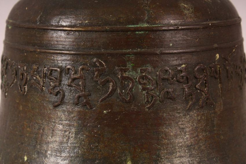 A TIBETAN CAST BRONZE TEMPLE BELL, with a band of calligraphy to the exterior and a possible signature to the interior, 23cm diameter.