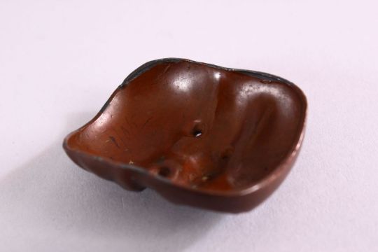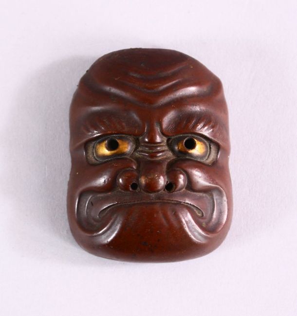 A JAPANESE MEIJI PERIOD BRONZE NOH MASK, with gilt eye decoration, 5.5cm high x 4cm