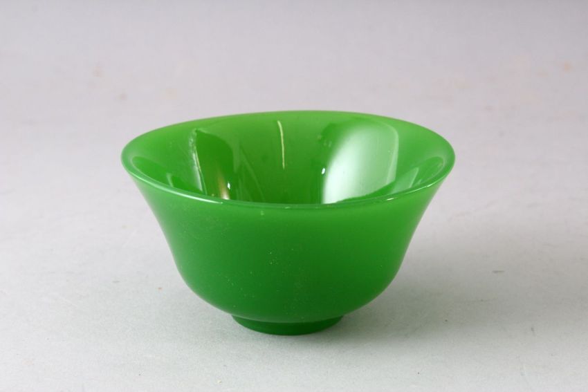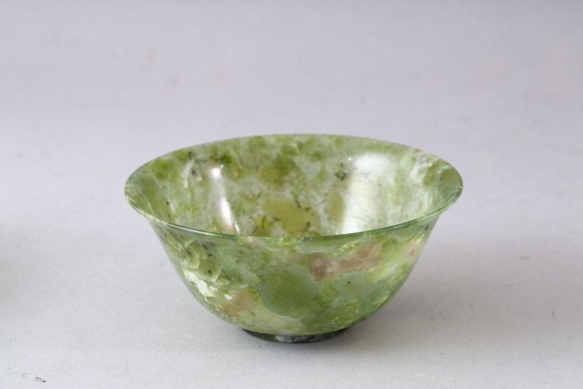 A SMALL PEKING GLASS BOWL and a similar bowenite bowl, both 10cm diameter.
