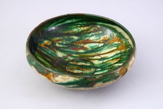 A GOOD PERSIAN NISHAPUR THREE COLOUR POTTERY DISH, with carved lappet decoration interior, 19cm diameter.