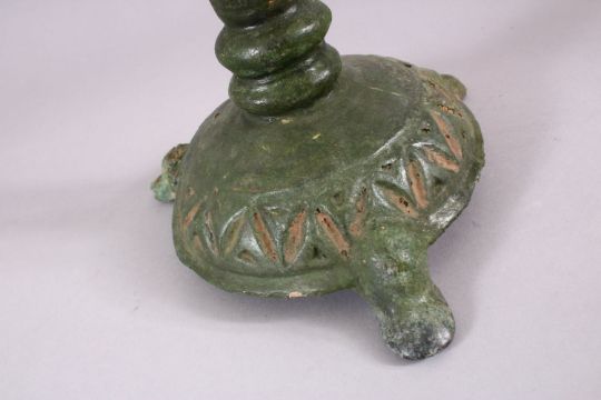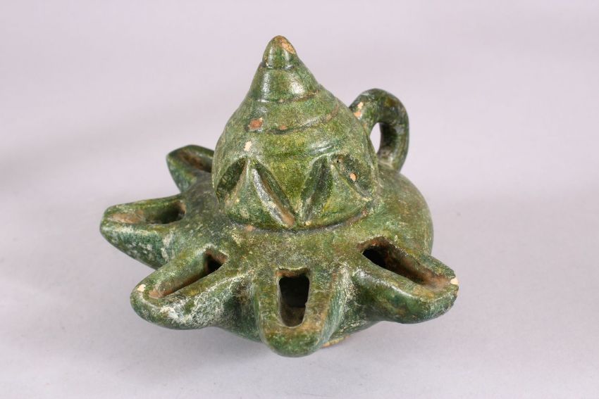 A UNUSUAL EARLY ISLAMIC POTTERY OIL LAMP ON STAND, 46cm high.