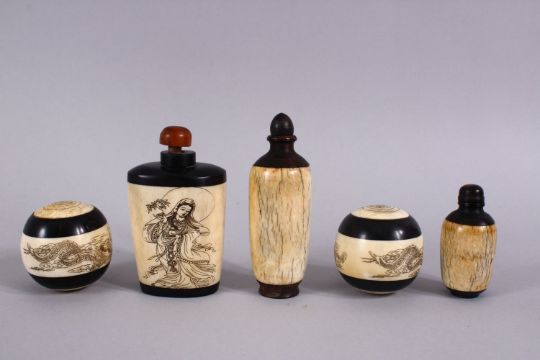 A GROUP OF 19TH CENTURY CARVED IVORY SNUFF BOTTLES & BALLS, three incised ivory snuff bottles, each with varying views of landscapes or figures, 8.5cm , 8cm & 5cm, together with two carved and incised ivory balls, 4.5cm.