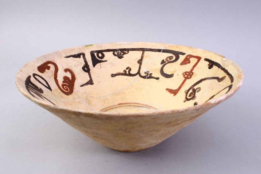 A GOOD EARLY ISLAMIC POTTERY BOWL, with painted decoration interior, (AF), 29cm diameter.