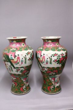 A LARGE PAIR OF JAPANESE FAMILLE ROSE STYLE PORCELAIN VASES, decorated with canton style decoration and figures in landscapes, 63cm.