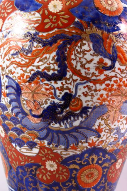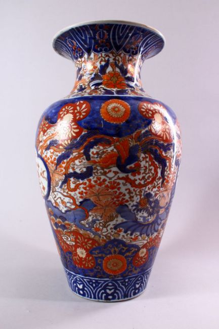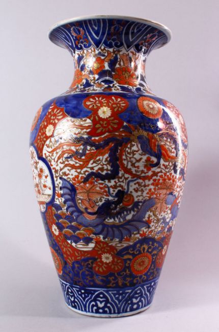 A LARGE JAPANESE MEIJI PERIOD IMARI PORCELAIN VASE, decorated with views of a dragon and phoenix amongst waves, and scrolling flora, with typical imari palate decoration, bamboo mark to base, 46.5cm high
