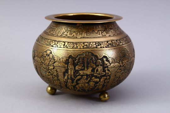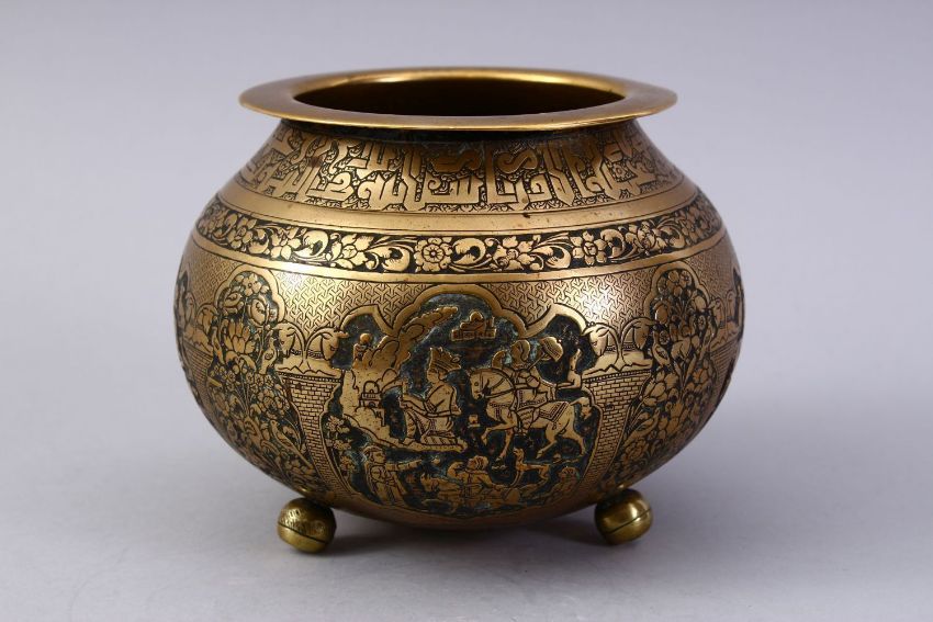 A GOOD ISLAMIC BRASS TRIPLE FOOT CALLIGRAPHIC BOWL, with panels of figures and bands of calligraphy, 13cm high x 16cm diameter.