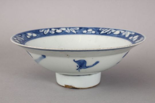 A GOOD 18TH / 19TH CENTURY CHINESE BLUE & WHITE PORCELAIN STEM BOWL, decorated with a roundel of landscape views, the exterior decorated with figures in landscape settings, base with double blue rings, 14cm diameter x 5cm high.