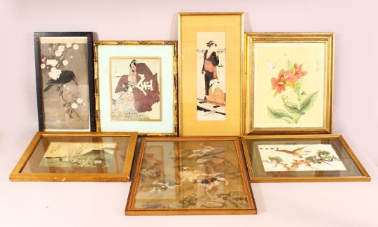 A MID 20TH CENTURY SCHOOL CHINESE PAINTING ON SILK depicting four shi-shi dogs in a landscape, image 46cm x 34cm, together with six other various prints and textiles.