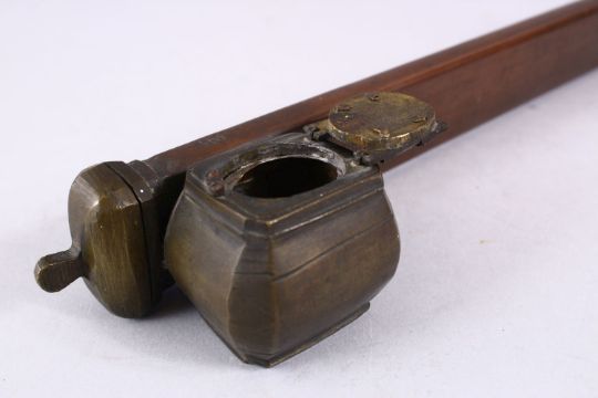 A GOOD ISLAMIC BRASS SIGNED INKWELL AND PEN HOLDER, 25CM X 5CM.
